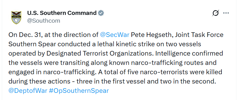 El Ejército de Estados Unidos informó sobre la destrucción de dos supuestas narcolanchas en una operación militar desarrollada el miércoles 31 de diciembre de 2025, acción que dejó cinco personas muertas, según el balance divulgado por el Comando Sur estadounidense. El anuncio se realizó a través de un mensaje publicado en X, en el que no se precisó la ubicación exacta del ataque.