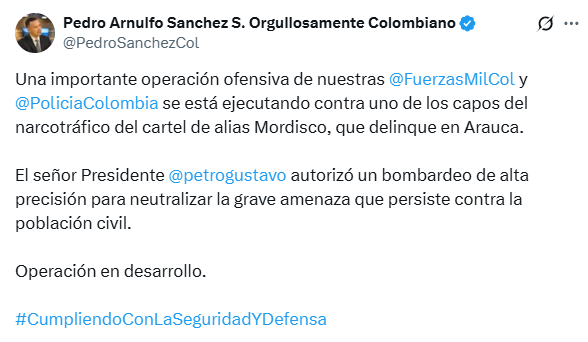 El ministro de Defensa, Pedro Sánchez, señaló que la operación fue dirigida contra uno de los principales mandos del narcotráfico asociados al denominado cartel de ‘Iván Mordisco’, con presencia activa en el departamento de Arauca. Explicó además que el presidente Petro autorizó el uso de un bombardeo de precisión con el fin de neutralizar la amenaza que representa este grupo armado para la población civil.