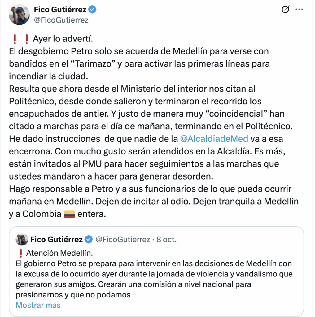 Gutiérrez aseguró que “el desgobierno Petro solo se acuerda de Medellín para verse con bandidos en el ‘Tarimazo’ y para activar las primeras líneas”. Añadió que la convocatoria desde el Ministerio coincide con el llamado a marchas programadas para el día siguiente, cuyo recorrido termina también en el Politécnico. “He dado instrucciones de que nadie de la Alcaldía de Medellín va a esa encerrona. Con mucho gusto serán atendidos en la Alcaldía. Es más, están invitados al PMU para hacer seguimiento a las marchas que ustedes mandaron a hacer para generar desorden”, expresó el mandatario.