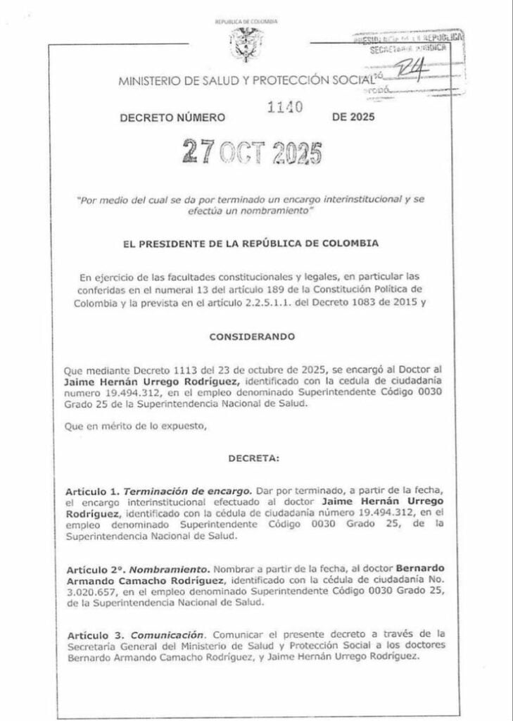 El Gobierno nacional oficializó un relevo en la Superintendencia Nacional de Salud a través del Decreto 1140 del 27 de octubre de 2025, expedido por el Presidente de la República y el Ministerio de Salud y Protección Social.