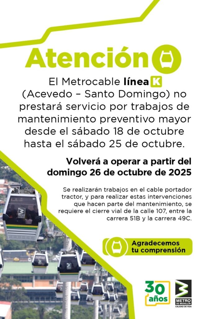 El Metro de Medellín informó que el Metrocable línea K (Acevedo – Santo Domingo) no prestará servicio entre el sábado 18 y el sábado 25 de octubre de 2025 debido a trabajos de mantenimiento preventivo mayor programados en la infraestructura del sistema.