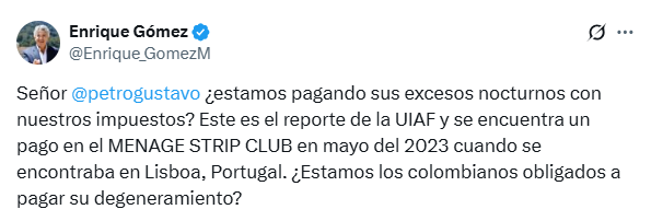 “Señor Petro Gustavo, ¿estamos pagando sus excesos nocturnos con nuestros impuestos? Este es el reporte de la UIAF y se encuentra un pago en el MENAGE STRIP CLUB en mayo del 2023, cuando se encontraba en Lisboa, Portugal. ¿Estamos los colombianos obligados a pagar su degeneramiento?“, señaló Enrique Gómez.