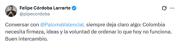 “Conversar con Paloma Valencia siempre deja claro algo: Colombia necesita firmeza, ideas y la voluntad de ordenar lo que hoy no funciona. Buen intercambio”, escribió Córdoba en su cuenta.