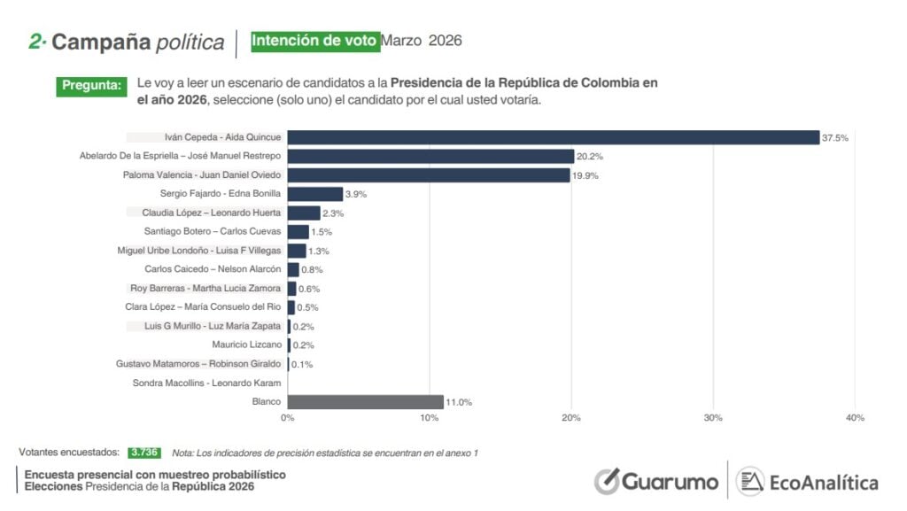 La más reciente encuesta de Guarumo y Ecoanalítica, realizada entre el 19 y el 25 de marzo en 69 municipios del país, muestra un escenario en el que se reduce la distancia entre los aspirantes al segundo lugar en la intención de voto de cara a las elecciones presidenciales del 31 de mayo, mientras Cepeda se mantiene al frente de la contienda.