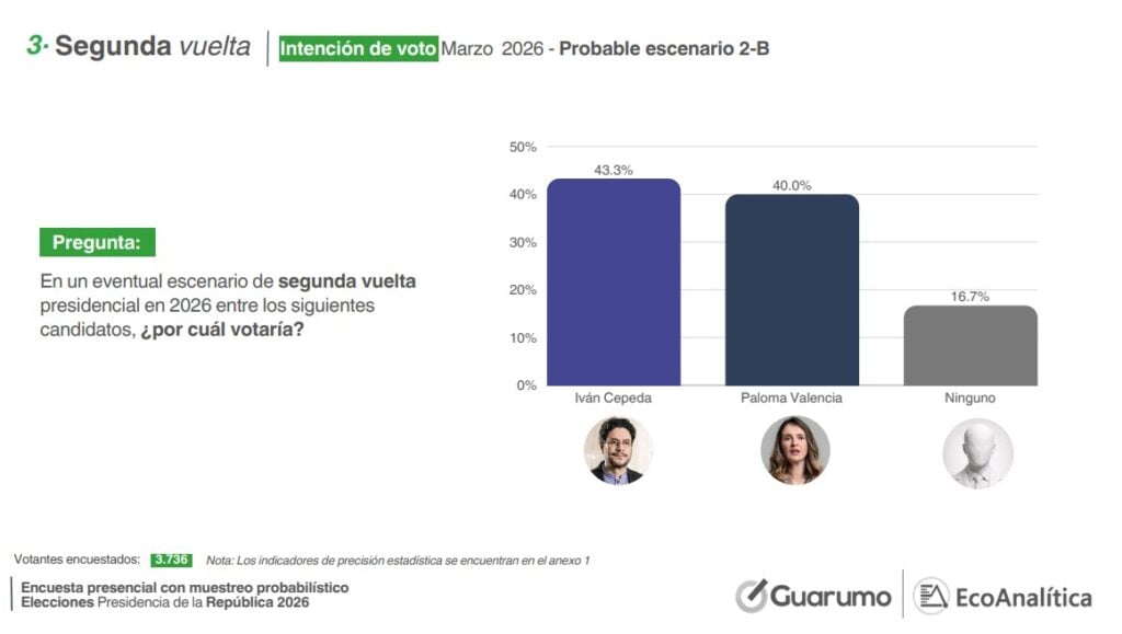 En los escenarios de segunda vuelta evaluados por la encuesta, Cepeda se mantiene como uno de los candidatos con mayor intención de voto, aunque con diferencias frente a ejercicios previos. En una eventual contienda con Paloma Valencia, los resultados muestran un 43,3% para Cepeda y un 40% para la candidata del Centro Democrático, lo que, dentro del margen de error, configura un empate técnico.