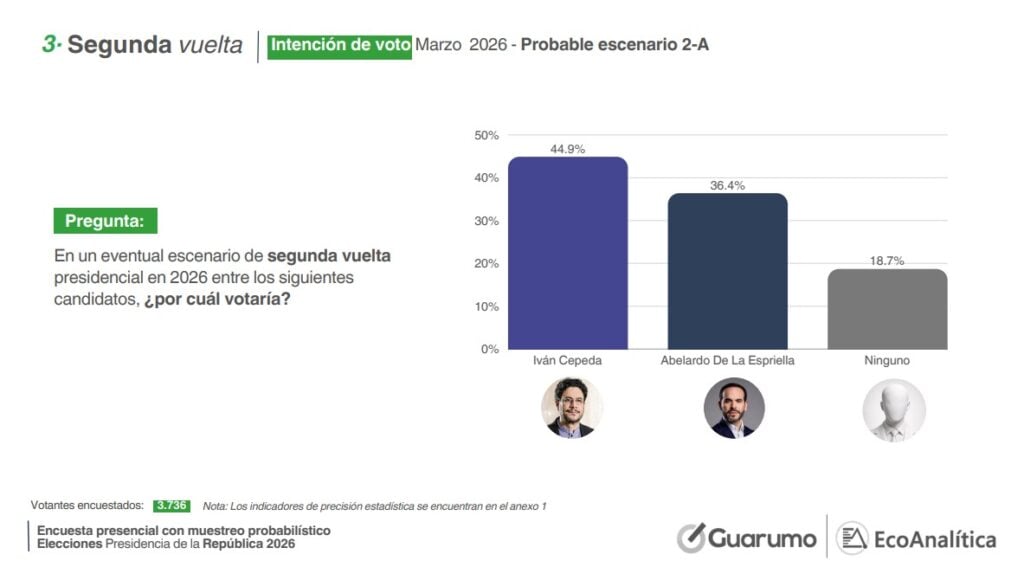 En contraste, De la Espriella presenta una variación frente a mediciones anteriores. Luego de alcanzar el 22,6% en febrero, en esta encuesta desciende al 20,2%, manteniéndose en la disputa directa por el segundo lugar. La cercanía entre ambos candidatos se da dentro del margen de error del estudio, fijado en 2,2%, lo que mantiene abierta la definición de quién acompañaría a Cepeda en una eventual segunda vuelta.