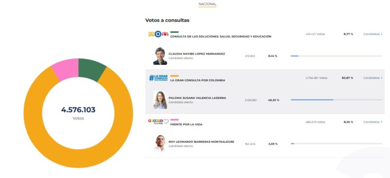 Entre las consultas realizadas por diferentes sectores políticos, la denominada “La Gran Consulta por Colombia” concentra la mayor cantidad de votos dentro del reporte preliminar. Según el boletín, esta consulta acumula 3.665.486 sufragios, lo que corresponde al 82,87% del total de votos válidos registrados en las consultas.