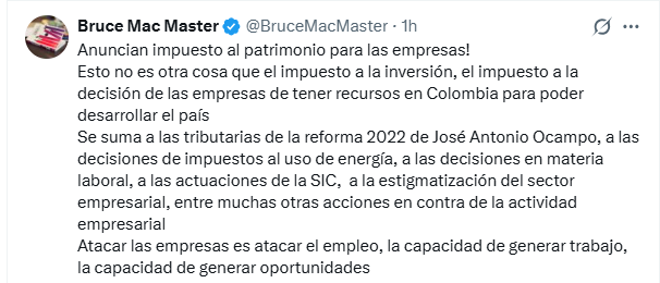La reacción del gremio empresarial fue inmediata. Bruce Mac Master, presidente de la Andi, afirmó en su cuenta de X que el impuesto propuesto equivale a gravar la inversión y la decisión de las compañías de mantener capital en Colombia.