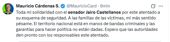 El precandidato Mauricio Cárdenas, se pronunció a través de su cuenta de X y envió toda su solidaridad al senador Castellanos por este atentado a su esquema de seguridad. Así mismo, envió un sentido pésame a las familias de las víctimas. Recordó que el territorio nacional está en manos de bandas criminales y las garantías para hacer política no están dadas.
