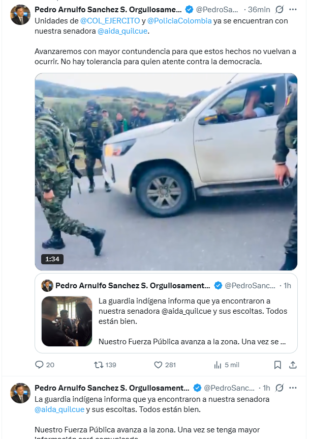 Horas antes, en la tarde del 10 de febrero, la cuenta de X de la senadora difundió un mensaje en el que se advertía que Quilcué y su esquema de seguridad habrían sido interceptados en el tramo vial entre Inzá y Totoró, en el oriente del Cauca.