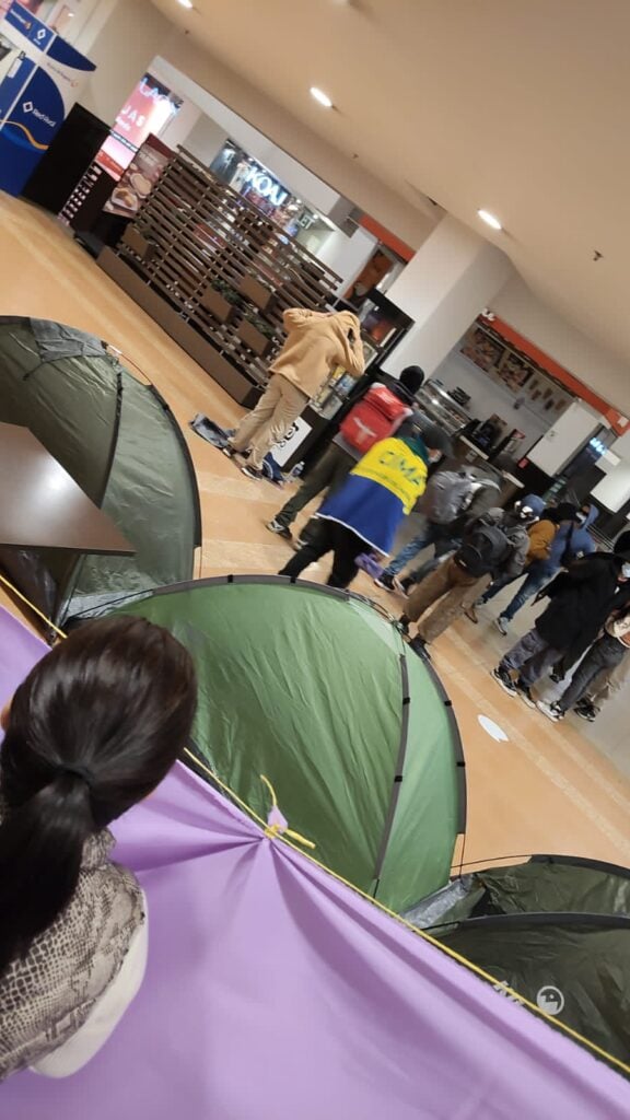 En las imágenes se observan las carpas y pendones ubicados de forma organizada en los pasillos y accesos del centro comercial, así como los parqueaderos cerrados por los participantes de la protesta.