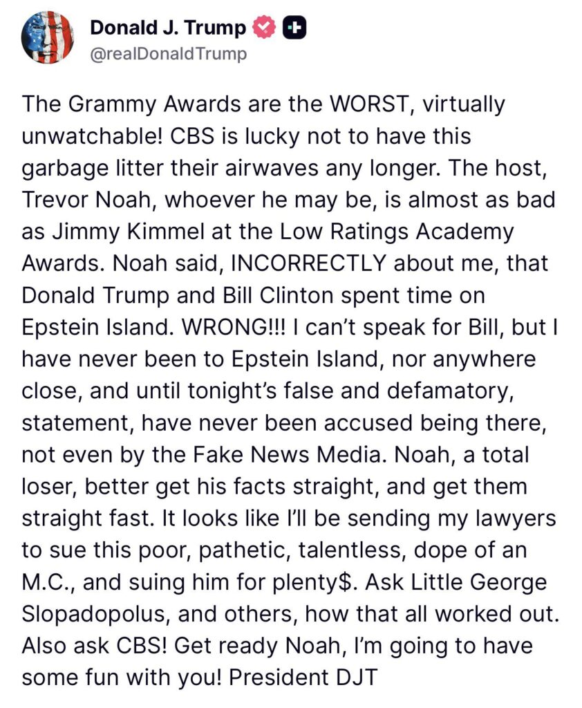 En su mensaje, Trump rechazó de forma explícita la afirmación y sostuvo que nunca ha estado en la isla de Epstein ni en lugares cercanos. Escribió que la declaración era “falsa y difamatoria” y aseguró que antes de ese comentario no había sido acusado de haber visitado ese lugar. El presidente también criticó la ceremonia y la cadena que transmitió la gala, a la que calificó como imposible de ver.