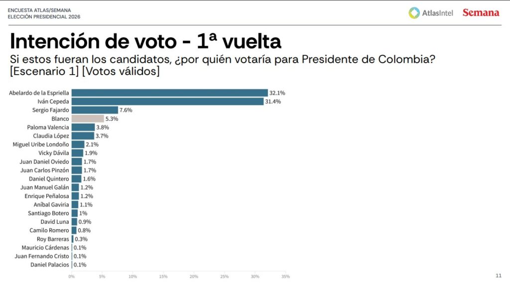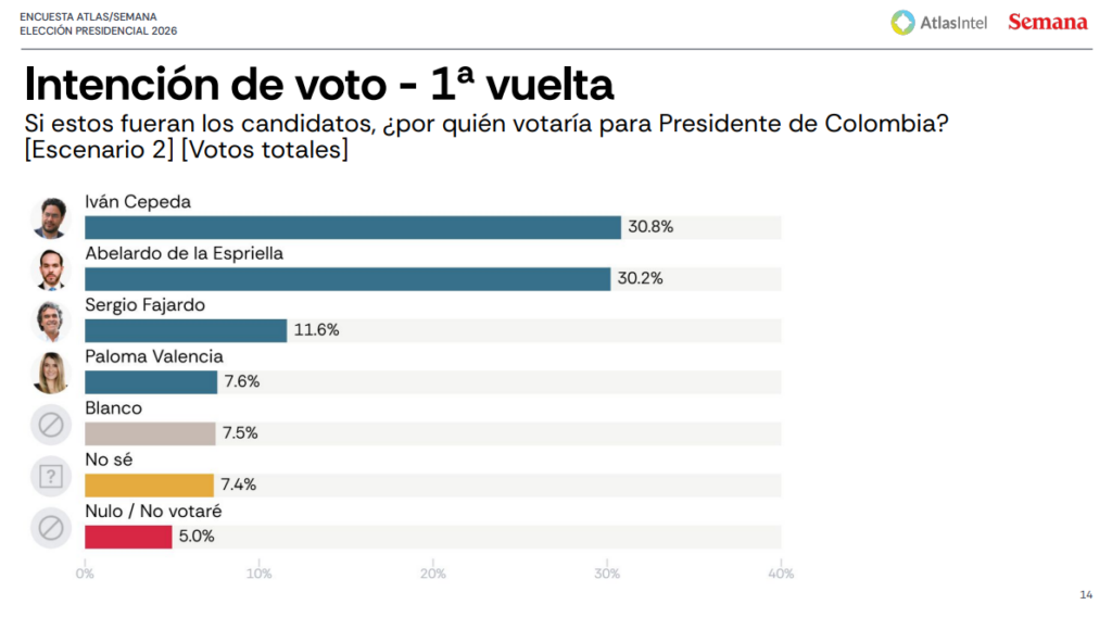 AtlasIntel señaló que la suma de indecisos y voto en blanco ronda el 30% en algunos escenarios de segunda vuelta, un bloque que podría influir en la distribución final de apoyos. Ni Cepeda ni De la Espriella participarán en las consultas interpartidistas del 8 de marzo, jornada que coincidirá con las elecciones al Congreso. La medición los ubica como los nombres con mayor concentración de intención de voto en el panorama nacional actual.