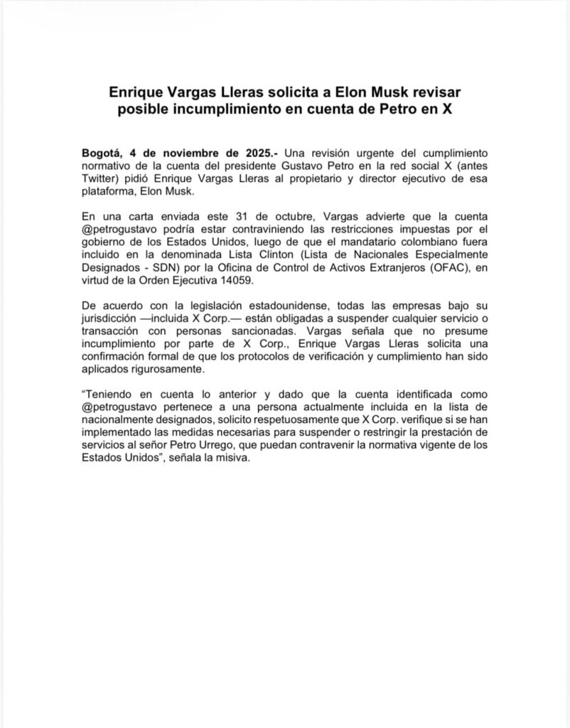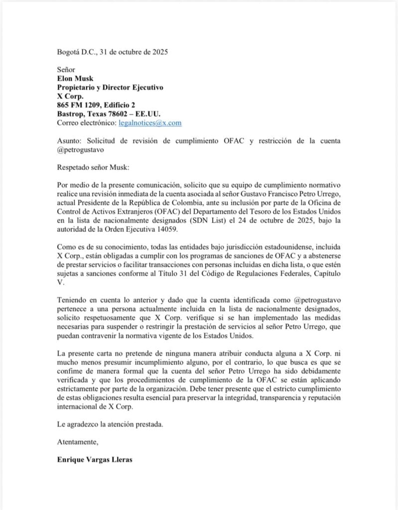 Vargas Lleras aclaró que su comunicación “no pretende de ninguna manera atribuir conducta alguna a X Corp. ni mucho menos presumir incumplimiento alguno”, sino que busca la confirmación formal de que la empresa está aplicando “los procedimientos de cumplimiento de la OFAC estrictamente por parte de la organización”.