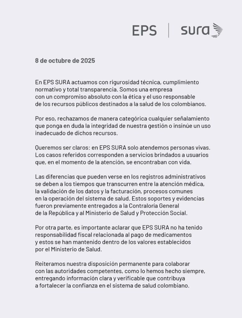 “En EPS SURA actuamos con rigurosidad técnica, cumplimiento normativo y total transparencia. Somos una empresa con un compromiso absoluto con la ética y el uso responsable de los recursos públicos destinados a la salud de los colombianos”, señala el documento.