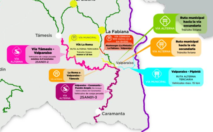 - Concepción – Alejandría: se restringe el paso de vehículos de carga con peso bruto vehicular superior a 16 toneladas en la vía según Resolución No. 2022060032132 de la Agencia de Seguridad Vial Departamental del 2 de junio de 2022.