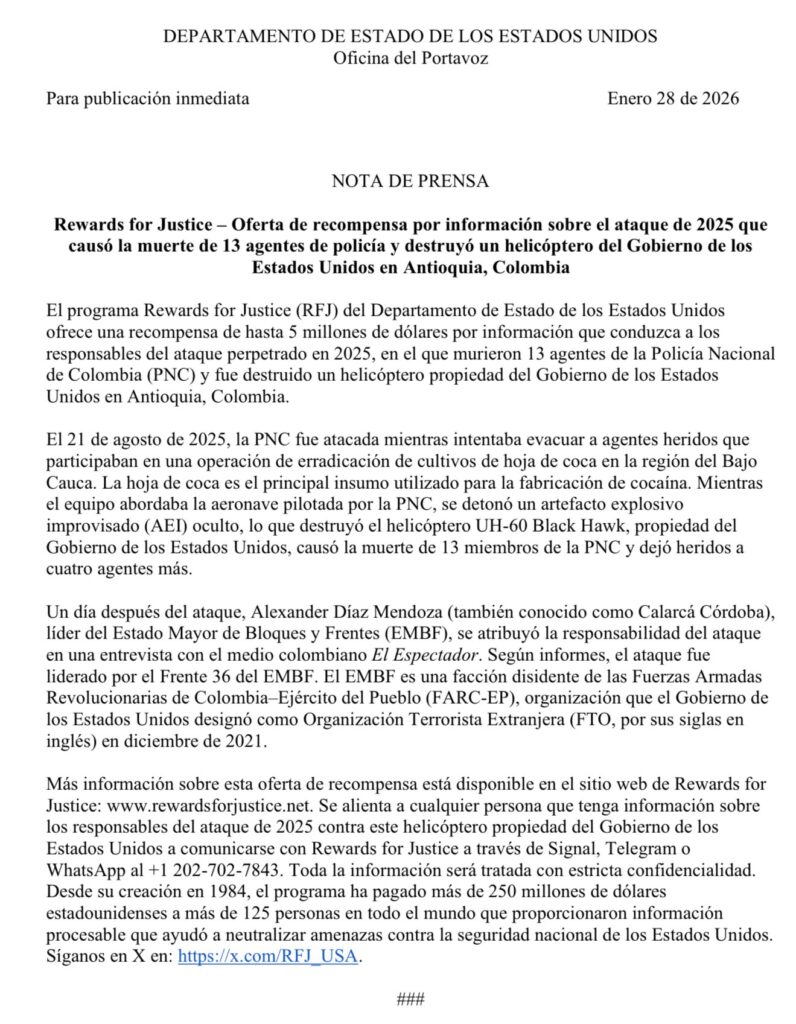 El Departamento de Estado de los Estados Unidos, a través del programa Rewards for Justice, anunció una recompensa de hasta cinco millones de dólares por información que conduzca a los responsables del ataque perpetrado en 2025 en Antioquia, Colombia, en el que murieron 13 integrantes de la Policía Nacional y fue destruido un helicóptero UH-60 Black Hawk, propiedad del Gobierno estadounidense.