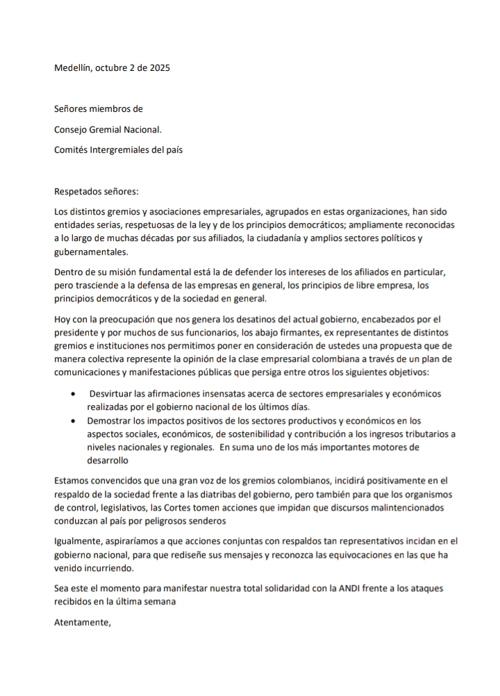 Los firmantes aseguran que una postura unificada de los gremios colombianos podría generar un respaldo ciudadano frente a los discursos del Gobierno, así como motivar a los organismos de control, las Cortes y el Congreso a actuar ante lo que consideran mensajes “malintencionados” que podrían poner en riesgo la estabilidad del país.