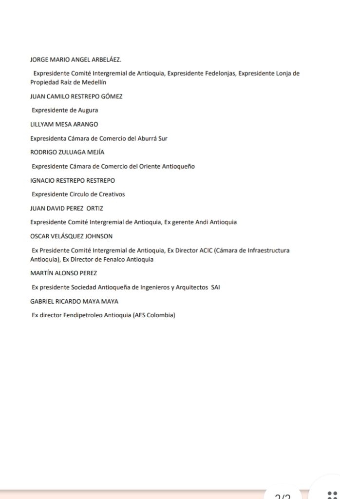 La carta fue firmada por Jorge Mario Ángel Arbeláez, expresidente del Comité Intergremial de Antioquia, Fedelonjas y la Lonja de Propiedad Raíz de Medellín; Juan Camilo Restrepo Gómez, expresidente de Augura; Lillyam Mesa Arango, expresidenta de la Cámara de Comercio del Aburrá Sur; Rodrigo Zuluaga Mejía, expresidente de la Cámara de Comercio del Oriente Antioqueño; Ignacio Restrepo Restrepo, expresidente del Círculo de Creativos; Juan David Pérez Ortiz, expresidente del Comité Intergremial de Antioquia y exgerente de la ANDI Antioquia; Óscar Velásquez Johnson, expresidente del Comité Intergremial de Antioquia y exdirector de ACIC y Fenalco Antioquia; Martín Alonso Pérez, expresidente de la Sociedad Antioqueña de Ingenieros y Arquitectos (SAI); y Gabriel Ricardo Maya Maya, exdirector de Fendipetróleo Antioquia (AES Colombia).