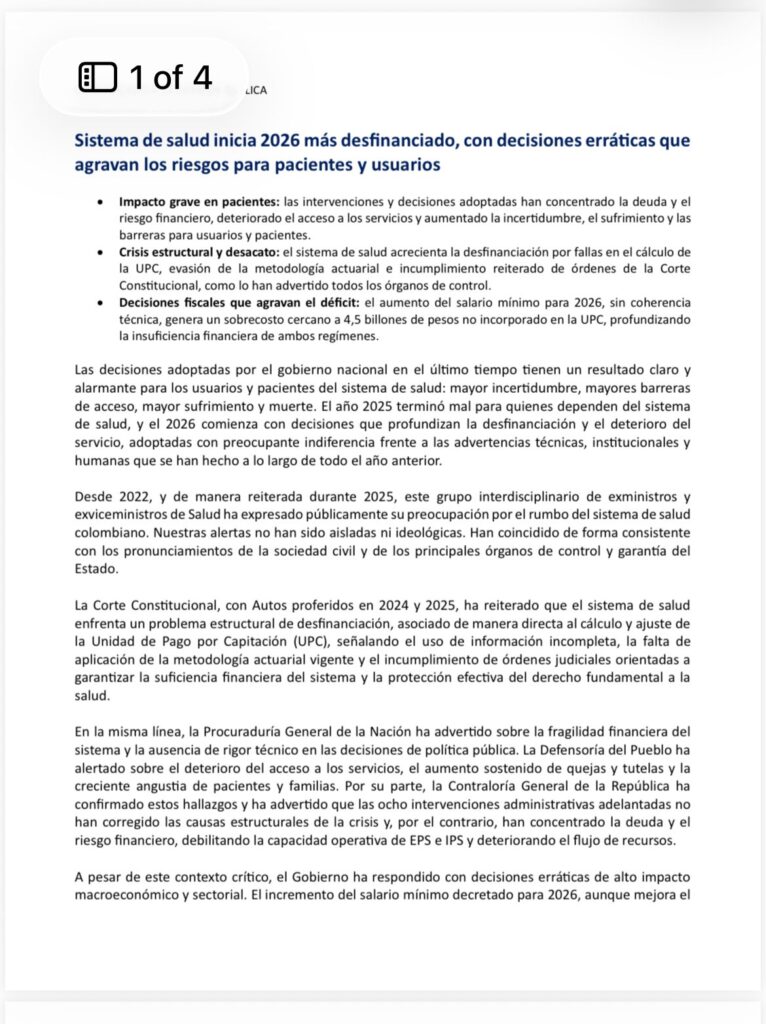 El grupo recordó que desde 2022 ha venido expresando su preocupación por el rumbo del sistema, alertas que, según indican, no han sido aisladas y han coincidido con los pronunciamientos de distintos órganos de control del Estado. En ese sentido, destacaron que la Corte Constitucional, mediante autos proferidos en 2024 y 2025, ha reiterado que existe un problema estructural de desfinanciación asociado al cálculo y ajuste de la Unidad de Pago por Capitación (UPC).