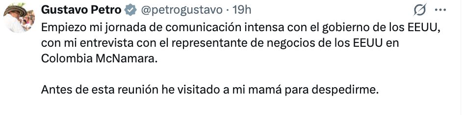 El tema cobró mayor relevancia luego de que el propio presidente Petro publicara un mensaje en su cuenta oficial de X, en el que hizo referencia a la reunión con Trump y, de manera inesperada, incluyó una mención personal sobre su madre. El trino, que posteriormente fue ampliamente comentado, fue interpretado por analistas y líderes políticos como un mensaje cargado de emotividad, temor y tensión, aunque desde el Gobierno no se ha ofrecido una explicación oficial sobre su alcance o intención.