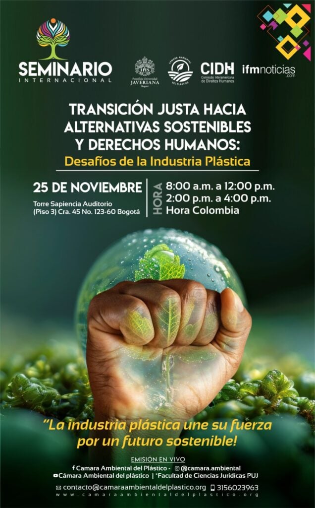 El evento, que se llevará a cabo en el Auditorio Torre Sapiencia de la Pontificia Universidad Javeriana en Bogotá, de 8:00 a.m. a 5:00 p.m., también será transmitido en vivo a través de las redes oficiales de la Cámara Ambiental del Plástico y de la Facultad de Ciencias Jurídicas de la universidad.