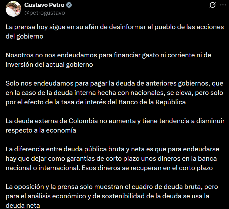 Se expuso así mismo que el objetivo central de la declaratoria era obtener recursos por 16,3 billones de pesos. El presidente Petro, con la intención de justificar el estado de emergencia, se amplió también en su cuenta de X diciendo que durante su mandato no se habían endeudado para financiar “gasto ni corriente ni de inversión del actual gobierno”.