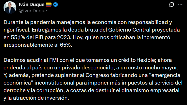 El expresidente Iván Duque respondió a las críticas del presidente Gustavo Petro sobre la situación fiscal del país y el aumento de la deuda pública, por medio de su cuenta de X.