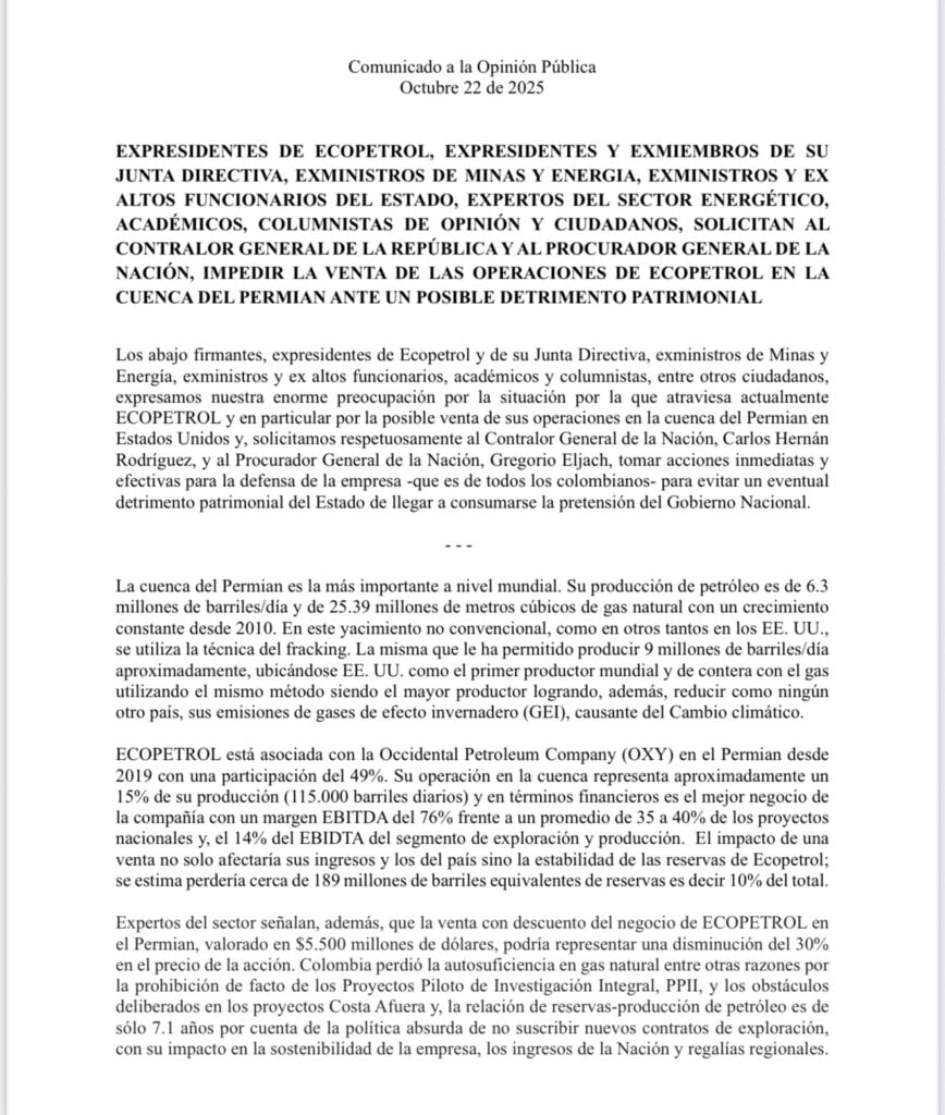 Un grupo de expresidentes y exmiembros de la Junta Directiva de Ecopetrol, junto con exministros de Minas y Energía, exfuncionarios del Estado, expertos del sector energético, académicos y columnistas, firmaron un comunicado dirigido a la Contraloría General de la República y a la Procuraduría General de la Nación solicitando acciones urgentes para impedir la venta de las operaciones de Ecopetrol en la cuenca del Permian, en Estados Unidos. Los firmantes advierten sobre un “posible detrimento patrimonial” para el Estado colombiano de concretarse la transacción.