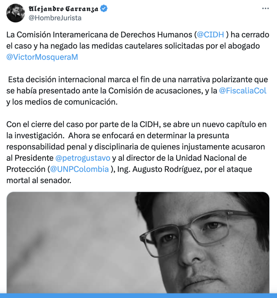 Carranza agregó que, con el cierre del caso por parte de la CIDH, «se abre un nuevo capítulo en la investigación. Ahora se enfocará en determinar la presunta responsabilidad penal y disciplinaria de quienes injustamente acusaron al Presidente Gustavo Petro y al director de la Unidad Nacional de Protección (UNP), Ing. Augusto Rodríguez, por el ataque mortal al senador.»