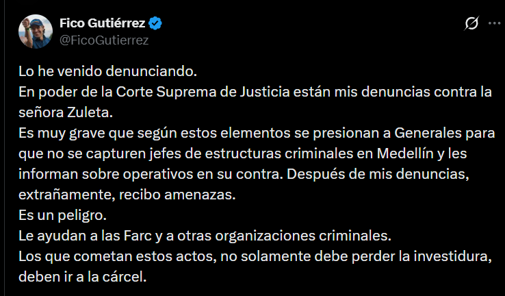 La denuncia sobre la que hizo referencia Federico Gutierrez, fue publicada en revista Semana, donde, según mencionó el medio, almenos ocho generales del Ejército y la Policía denunciaron que la senadora Isabel Cristina Zuleta, del Pacto Histórico, y personas de su círculo cercano habrían interferido en operativos e investigaciones contra estructuras criminales ligadas al narcotráfico, la minería ilegal y los homicidios en Antioquia.