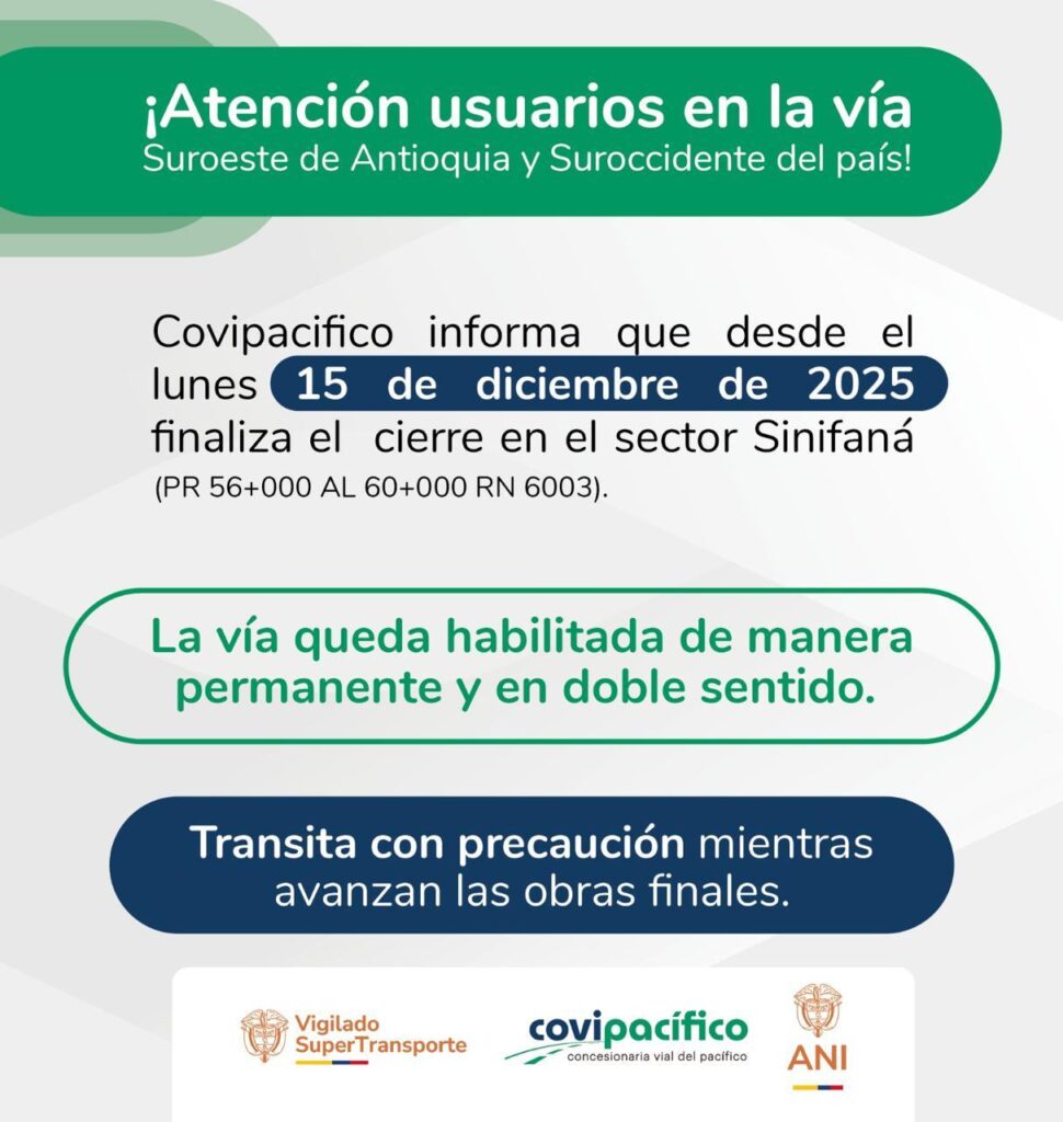 Desde este lunes 15 de diciembre de 2025 finalizará el horario de cierre que se venía aplicando en el sector de Sinifaná. De acuerdo con la información de la Concesión Covipacífico, el tramo quedará habilitado de manera permanente y en doble sentido de circulación, luego de la culminación de las principales obras de estabilización adelantadas en la zona.