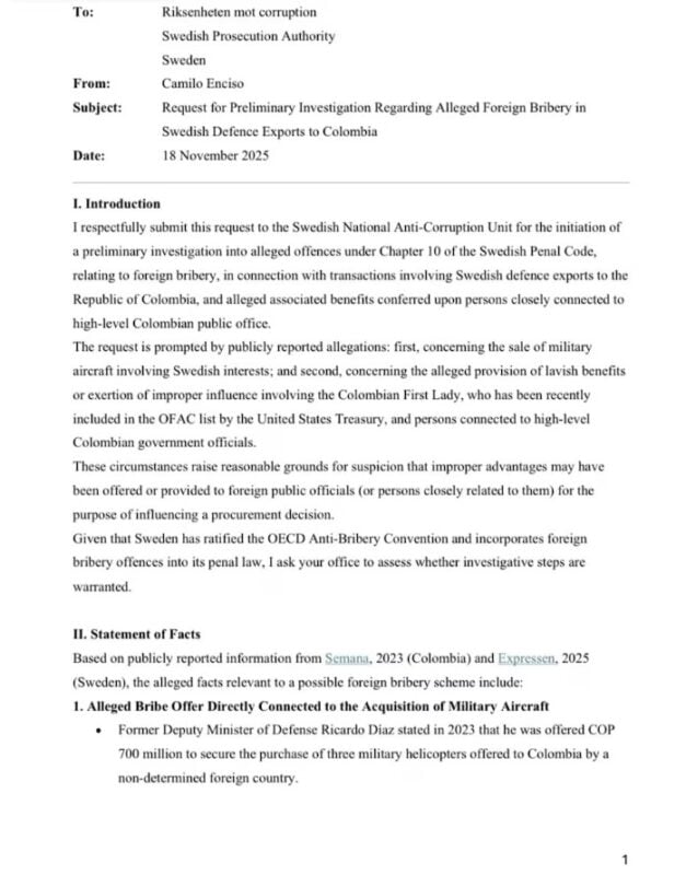 La Fiscalía Anticorrupción de Suecia confirmó la recepción de una solicitud presentada por Camilo Enciso, director del Instituto Anticorrupción de Colombia, en la que pide evaluar si existen elementos que ameriten una investigación preliminar por un posible caso de soborno transnacional relacionado con la venta de aviones Gripen al Estado colombiano.