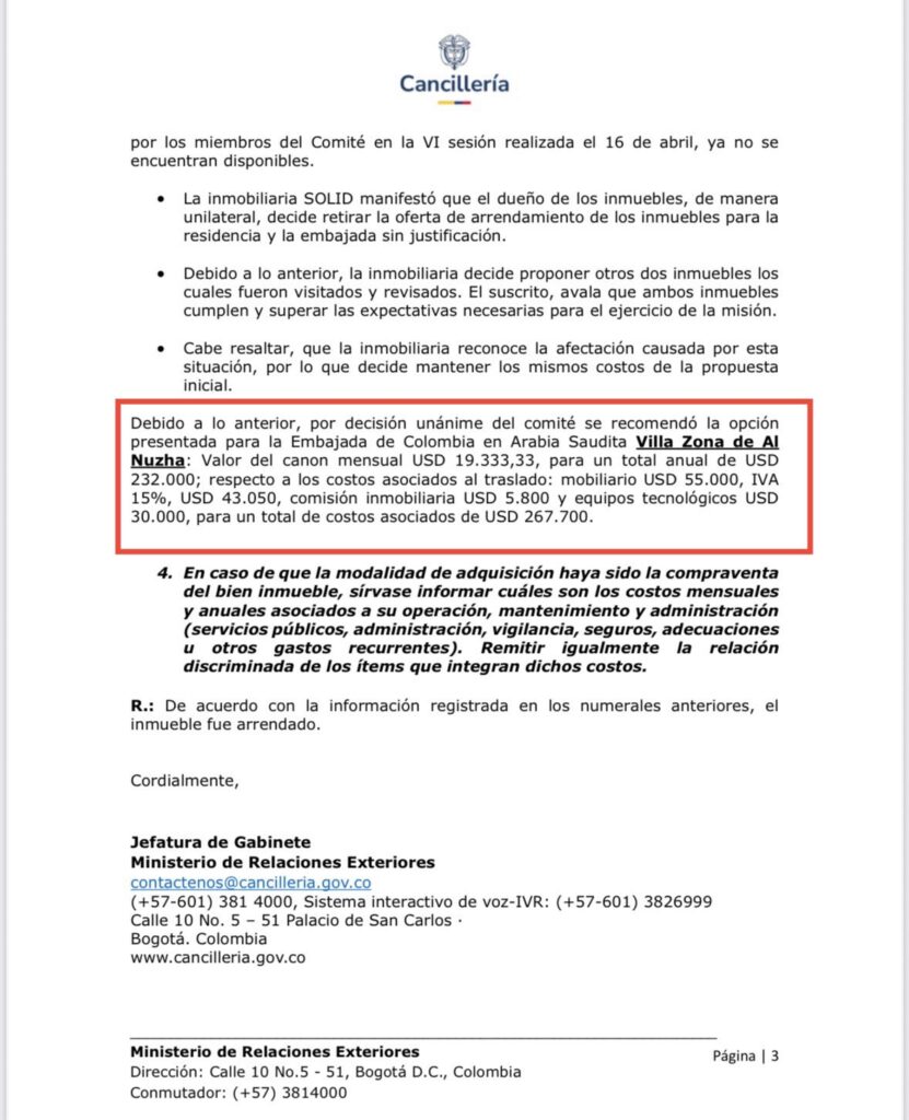Forero afirmó que, mientras existen dificultades para cubrir compromisos contractuales en entidades del sector público, se mantienen gastos elevados en el arrendamiento de inmuebles para misiones diplomáticas. En ese sentido, señaló que el monto anual destinado al arriendo de la Embajada en Arabia Saudita se aproxima a los $1.000 millones de pesos colombianos, de acuerdo con la tasa de cambio vigente.