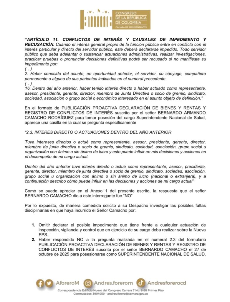 El congresista del Centro Democrático, Andrés Forero, solicitó a la Procuraduría General de la Nación revisar la posesión del superintendente Nacional de Salud, Bernardo Armando Camacho Rodríguez, por una posible omisión en su declaración de conflictos de interés.