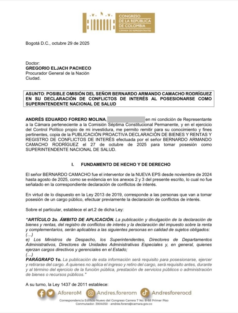 Según el representante, el funcionario no habría informado su vínculo previo con la Nueva EPS antes de asumir el cargo. El documento, radicado este 29 de octubre de 2025 y dirigido al procurador Gregorio Eljach, plantea que Camacho, quien tomó posesión el 27 de octubre, ejerció hasta agosto de este mismo año como interventor de la Nueva EPS, entidad bajo control estatal.