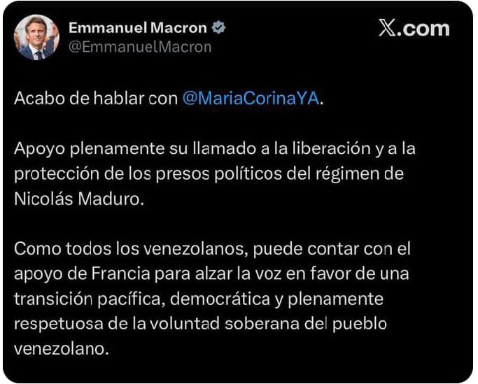 Macron señaló que Francia apoya el llamado realizado por Machado en favor de las personas detenidas por razones políticas bajo el gobierno de Nicolás Maduro. En su pronunciamiento, el jefe de Estado francés afirmó que la dirigente opositora puede contar con el respaldo de su país para promover una transición pacífica y democrática en Venezuela, enmarcada en el respeto pleno de los derechos.