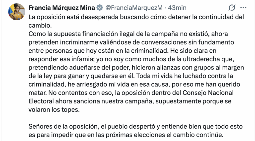 En su declaración pública, Márquez aseguró que existe una estrategia para involucrarla en supuestas irregularidades electorales. La vicepresidenta señaló: “La oposición está desesperada buscando cómo detener la continuidad del cambio. Como la supuesta financiación ilegal de la campaña no existió, ahora pretenden incriminarme valiéndose de conversaciones sin fundamento entre personas que hoy están en la criminalidad”.