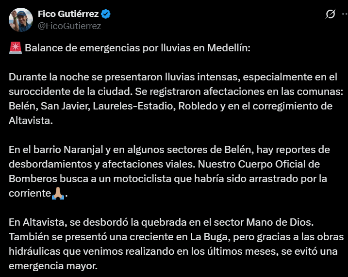 Luego de esto, el propio alcalde de Medellín, Federico Gutiérrez, el día de hoy 21 de octubre, publicó un balance de emergencia por lluvias, expresando que en horas de la noche se presentaron lluvias intensas, especialmente en el suroccidente de la ciudad, con afectaciones en las comunas: Belén, San Javier, Laureles-Estadio, Robledo y en el corregimiento de Altavista.