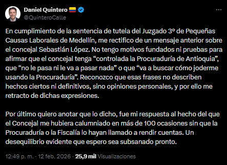 Posteriormente, Quintero hizo pública la rectificación a través de su cuenta en la red social X, donde informó que daba cumplimiento a lo dispuesto por el juzgado. En el mensaje indicó: “En cumplimiento de la sentencia de tutela del Juzgado 3º de Pequeñas Causas Laborales de Medellín, me rectifico de un mensaje anterior sobre el concejal Sebastián López. No tengo motivos fundados ni pruebas para afirmar que el concejal tenga ‘controlada la Procuraduría de Antioquia’, que ‘no le pasa ni le va a pasar nada’ o que ‘va a buscar cómo joderme usando la Procuraduría’”.