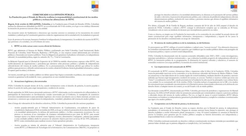La Fundación para el Estado de Derecho (FEDe Colombia) respondió al comunicado emitido por RTVC Sistema de Medios Públicos el pasado 15 de octubre, en el que se le atribuía la intención de promover actos de censura sobre la entidad.