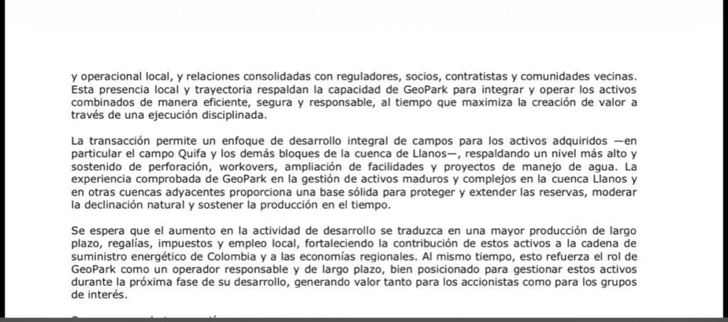 Según la empresa, la adquisición permitirá la creación de “una plataforma regional independiente líder de exploración y producción (E&P) en Colombia y Argentina”, lo que incrementará de manera sustancial el tamaño de GeoPark, su base de reservas y su generación de flujo de caja, al tiempo que refuerza su capacidad para financiar un crecimiento disciplinado a lo largo del ciclo.