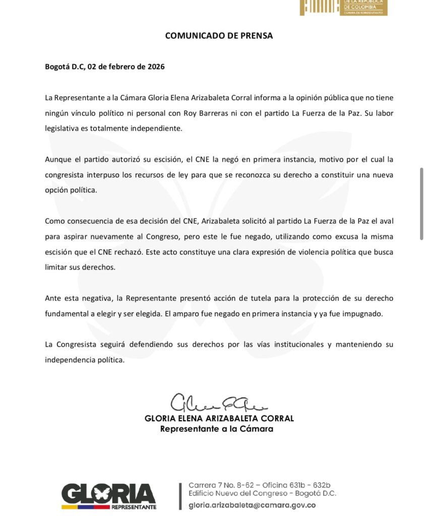 En el pronunciamiento público, la congresista reiteró que su actuación política no responde a intereses partidistas ni personales y que su trabajo legislativo se ha caracterizado por la independencia. “La Representante a la Cámara Gloria Elena Arizabaleta Corral informa a la opinión pública que no tiene ningún vínculo político ni personal con Roy Barreras ni con el partido La Fuerza de la Paz. Su labor legislativa es totalmente independiente”, señala el documento.