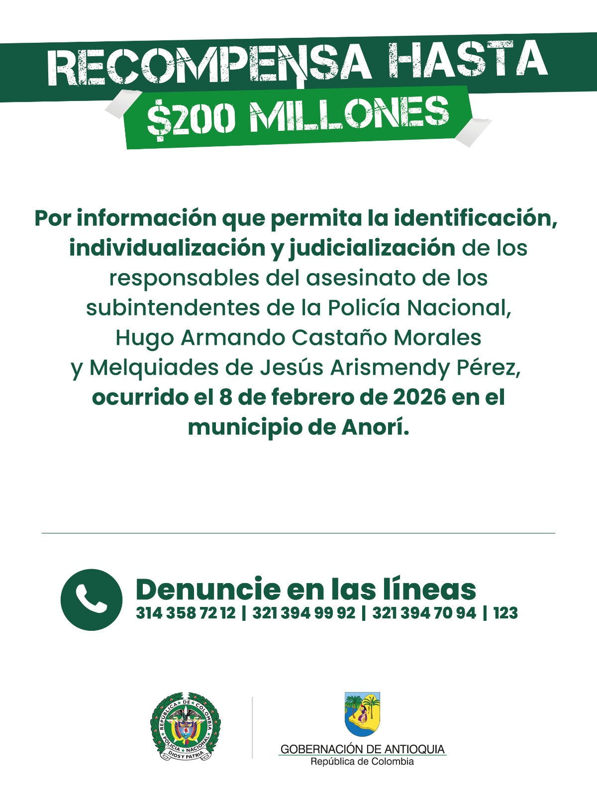 Como resultado del encuentro, la Gobernación anunció una recompensa de hasta 200 millones de pesos por información que conduzca a la captura de los responsables del crimen. Los subintendentes asesinados eran oriundos de Medellín y Vegachí y se encontraban cumpliendo labores de rutina en el parque central de Anorí.