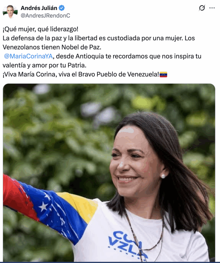A través de un pronunciamiento público, Rendón exaltó la labor de Machado y su papel en la defensa de la paz y la libertad en Venezuela. “¡Qué mujer, qué liderazgo! La defensa de la paz y la libertad es custodiada por una mujer. Los venezolanos tienen Nobel de Paz. María Corina, desde Antioquia te recordamos que nos inspira tu valentía y amor por tu patria. ¡Viva María Corina, viva el bravo pueblo de Venezuela!”, expresó el mandatario departamental.