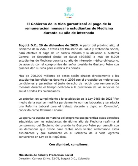 Desde el Ejecutivo se indicó que la puesta en marcha de esta medida busca dar cumplimiento a los compromisos adquiridos en el marco de la reforma laboral y responder a una demanda histórica de los estudiantes de medicina. Con la asignación presupuestal anunciada, el Gobierno prevé iniciar los pagos a partir de 2026, conforme a lo establecido en la ley y a los procedimientos administrativos definidos por el Ministerio de Salud y Protección Social.