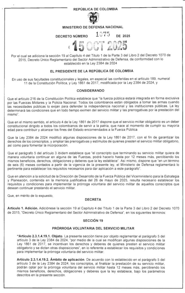 El Ministerio de Defensa Nacional expidió un decreto que permite a los jóvenes que actualmente prestan el servicio militar obligatorio extender de manera voluntaria su permanencia en las Fuerzas Militares por un periodo adicional de hasta doce meses.