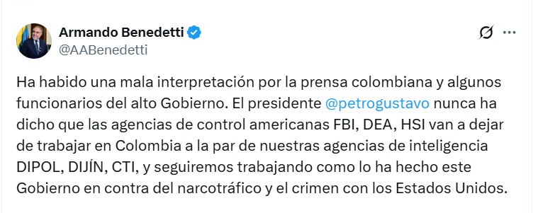 El ministro del Interior, Armando Benedetti, aseguró que las agencias de control de Estados Unidos continuarán trabajando en Colombia y compartiendo información de inteligencia con las autoridades nacionales.