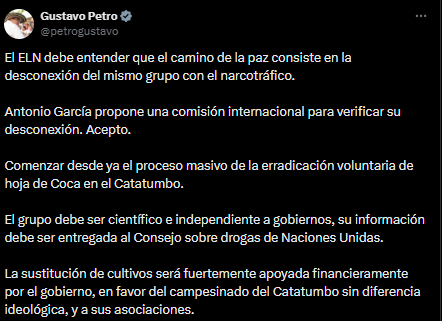 “Antonio García propone una comisión internacional para verificar su desconexión. Acepto”, escribió el jefe de Estado, quien además señaló que este mecanismo deberá ser científico e independiente de los gobiernos. También indicó que la información recopilada deberá ser entregada al Consejo sobre Drogas de Naciones Unidas.