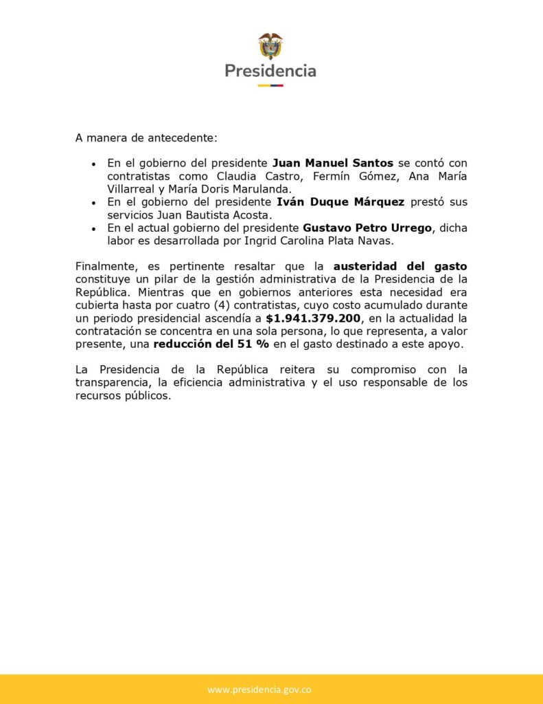 La Presidencia justificó que, mientras en gobiernos anteriores estas labores eran cubiertas por hasta cuatro contratistas, en la actualidad se ejecutan mediante un único contrato. De acuerdo con la entidad, el costo acumulado de esquemas anteriores ascendía a más de 1.900 millones de pesos por periodo presidencial. Bajo la estructura vigente, la Casa de Nariño reportó una disminución del 51% en el gasto destinado a ese componente.